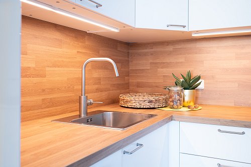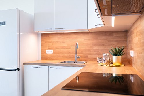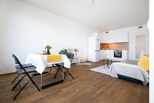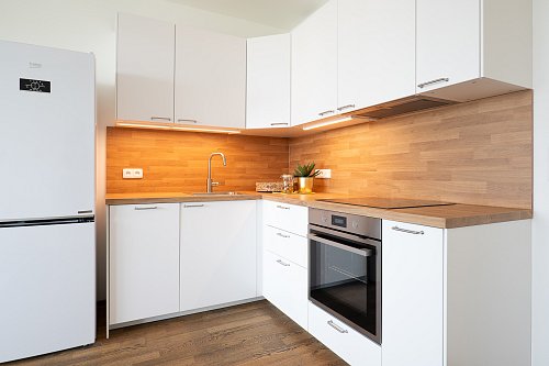 Byt je vybaven novou kuchyňskou linkou se všemi potřebnými vestavěnými spotřebiči a volně stojící lednicí s mrazákem. Ostatní místnosti jsou nezařízené, což Vám dává možnost vytvořit si interiér přesně podle Vašich představ.