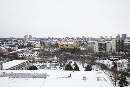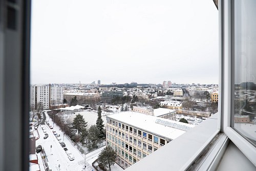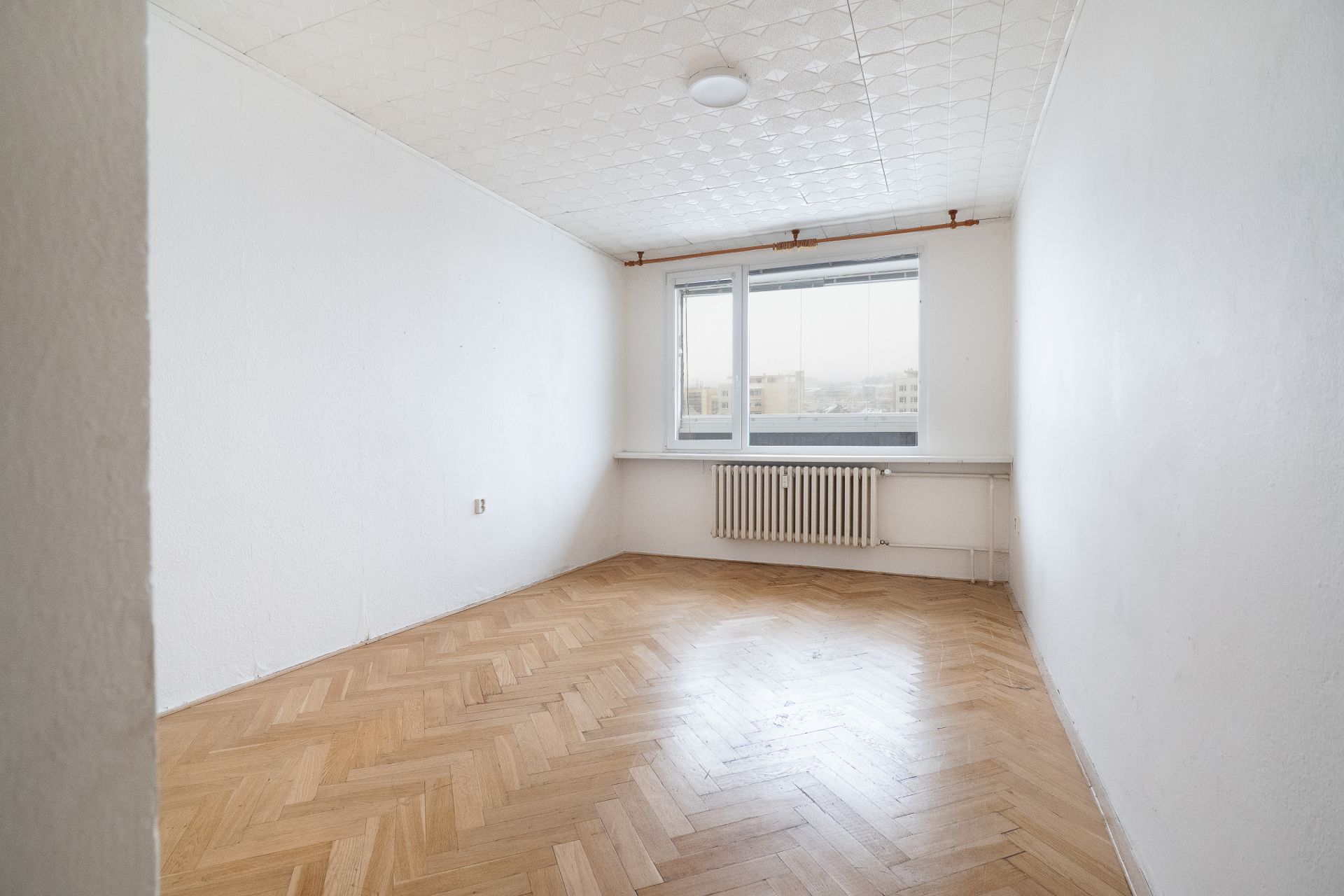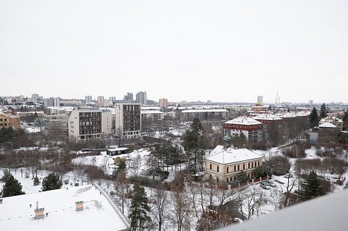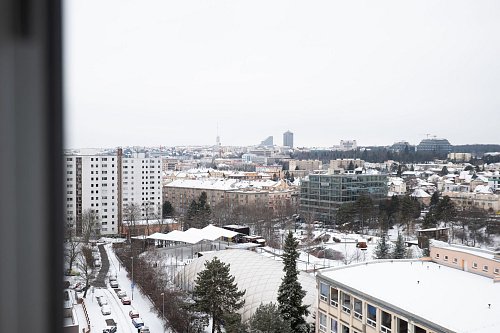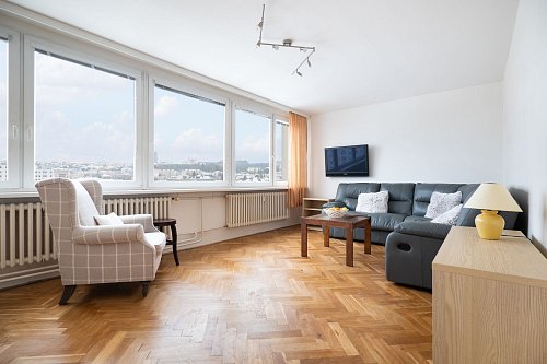 Jedná se o rohový byt, což znamená, že výhled není omezený pouze jedním směrem. Naopak – z téměř všech pokojů máte přímý kontakt s Prahou. Vidíte široké okolí, městskou strukturu i zeleň, a díky tomu byt působí velmi vzdušně a otevřeně.