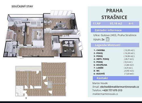 Byt o celkové ploše 107 m², z toho 86 m² obytná část, 6,9 m² lodžie a podíl na společných prostorech, se nachází v 11. patře panelového domu. Díky tomu nabízí nejen dostatek prostoru, ale i světlo a otevřený výhled, který je v této lokalitě opravdu výjimečný.