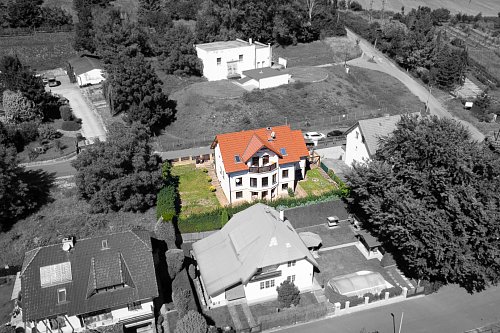 Tento rodinný dům disponuje 6 místnostmi, 1 velkým společným obývacím pokojem, 1 kuchyní a 1 vybudovaným kuchyňským koutem, 3 koupelnami, 2 pracovnami a 1 garáží s možností parkování několika aut před domem.