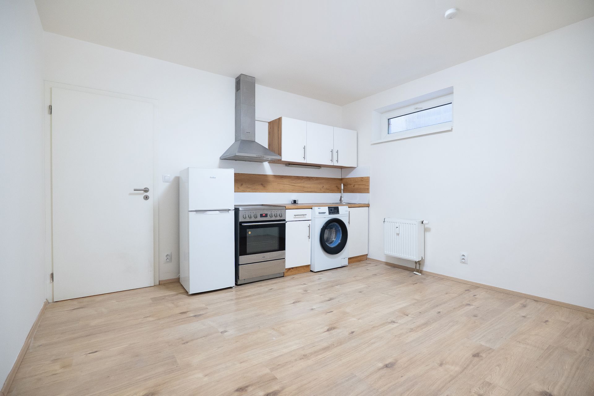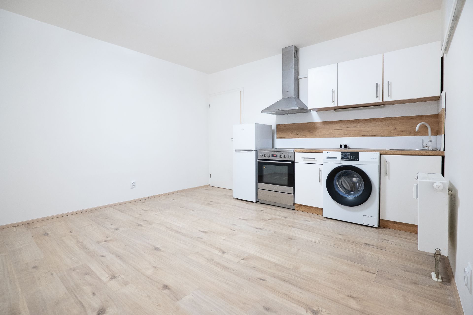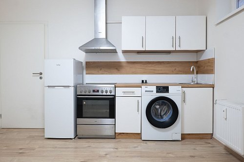 Ateliér je čerstvě vymalovaný, uklizený a připravený k nastěhování. Je částečně vybavený – k dispozici je kuchyňská linka se spotřebiči, konkrétně elektrický sporák s troubou, digestoř, pračka a lednice s mrazákem. Koupelna je moderní, se sprchovým koutem, v předsíni se nachází vestavěná skříň a věšáky na oblečení, které zajišťují praktický úložný prostor. Obytná část je jinak nezařízená, což dává novému nájemci volnost přizpůsobit si interiér podle vlastních představ.